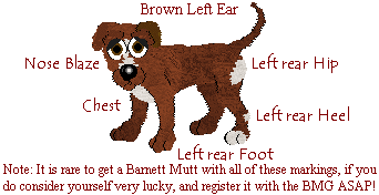 - Coat Colour: Coat colour must be red. Automatic disqualification for any colour other than red. Barnett Mutts must have at least 2 proper markings (see picture) to earn 3 points. Any dog with less than 2 proper markings is disqualified. Brown and white muzzles are also a serious fault, earning only 1 point. The more proper markings a dog has, the better. In the event of a tie in a show, the winner is the dog with more proper markings. Any dog with markings that are not proper (not in the exact spot as shown on picture) earn 2 points.